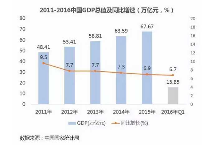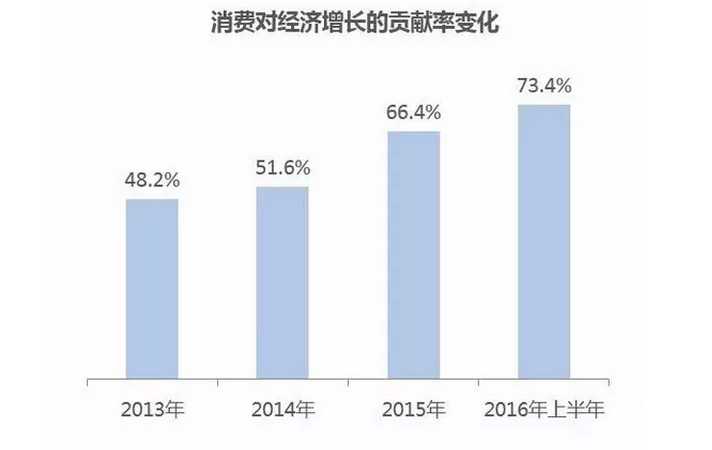 从 宏观大环境来看,2016 年国民经济延续 2015 年的zhongg速增长,GDP 增速难以逾越 7% 大关。与此同时,消费占经济增长的比率逐年提升,2016 年上半年达到 73.4%,成为经济增长的重要引擎。在经济进入zhongg速增长的新常态下,供给侧改革创新与居民消费升几的趋势显现。